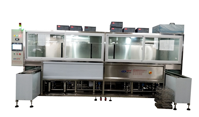 自動上料→1槽清洗劑超聲清洗28K→2槽清洗劑超聲清洗40K→3槽純水超聲漂洗28K→4槽純水超聲漂洗40K→5槽純水超聲漂洗40K→6槽熱風烘干→自動下料。